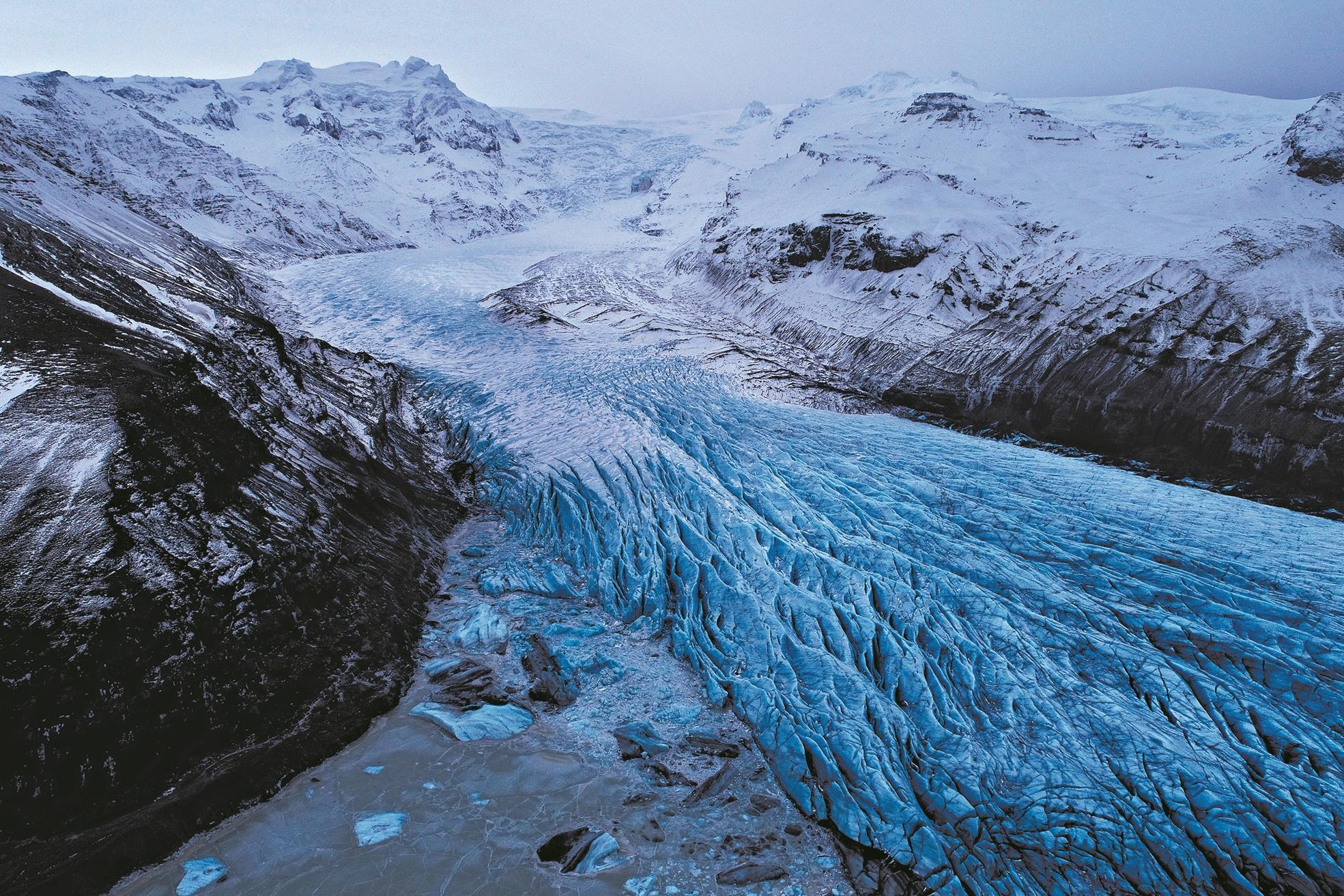 2018年1月27日,冰岛,凝固于白雪覆盖山脉之间的冰川,犹如大地的雕塑。