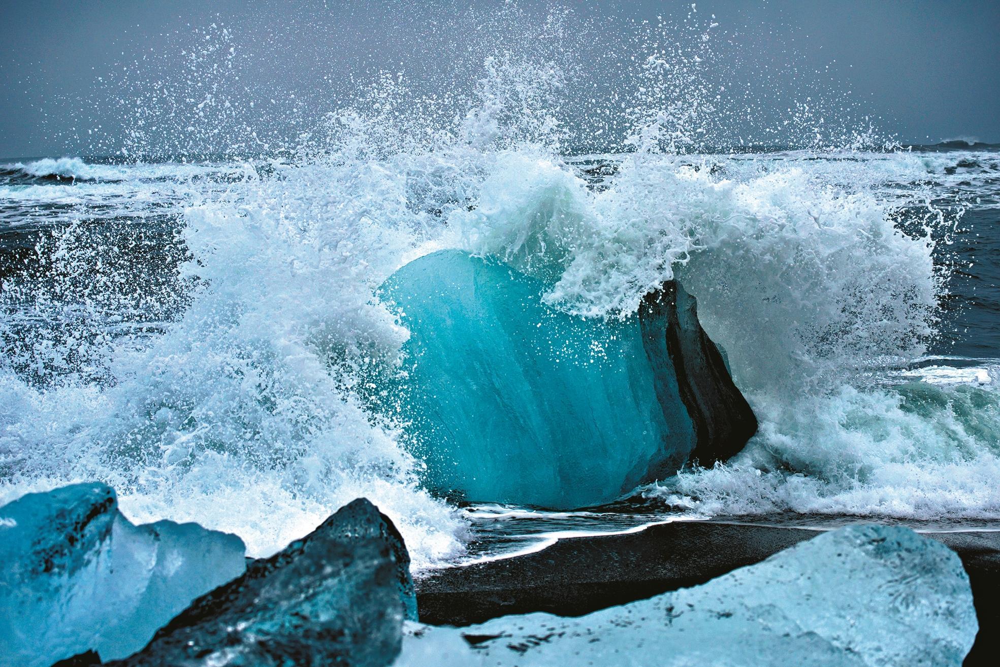 2017年1月27日,冰岛,海浪拍打着亚北极海岸边一个大块冰体。