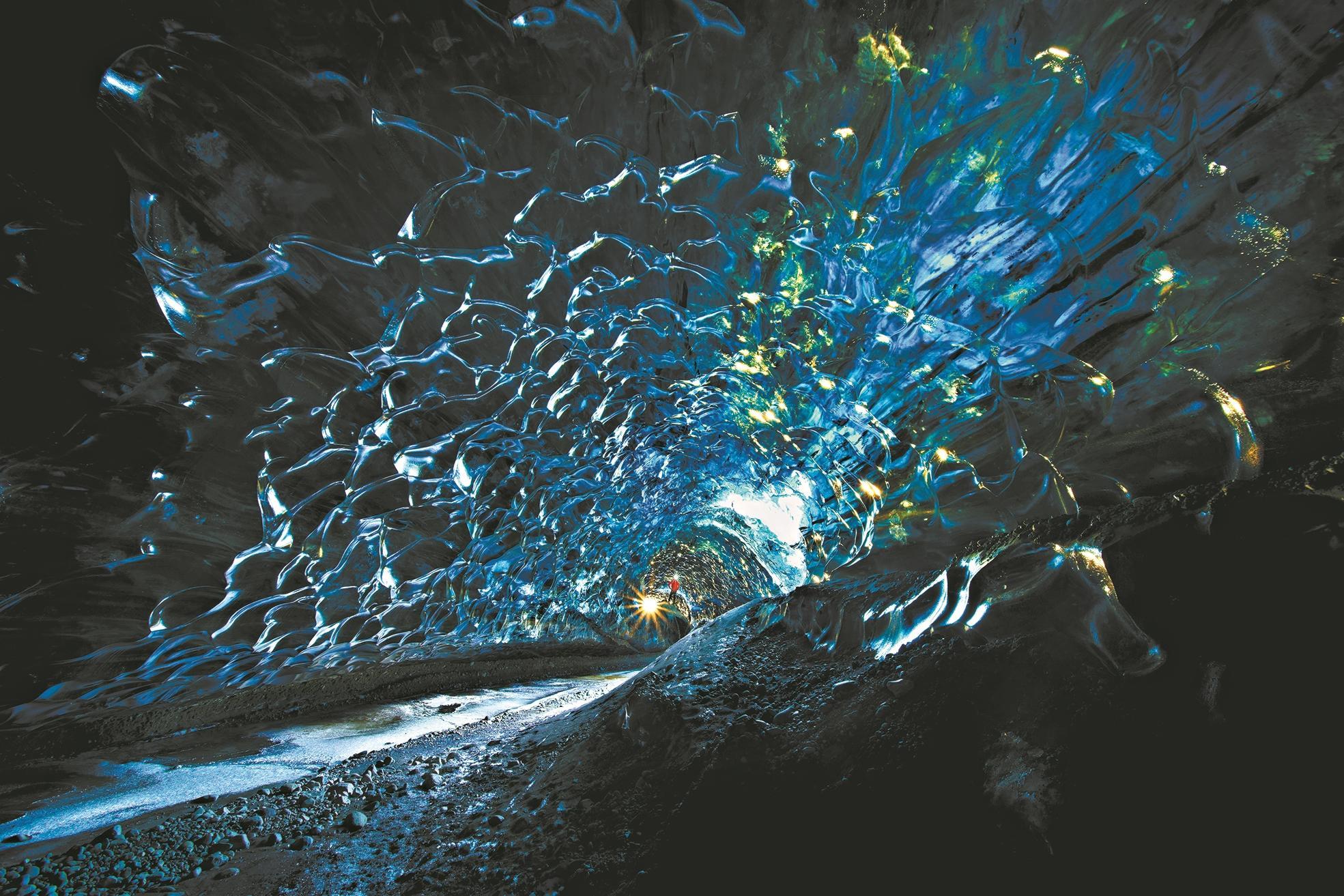 2018年1月28日,冰岛,亚北极冰洞的深处,洞壁闪耀着梦幻般的蓝色与金色光辉。